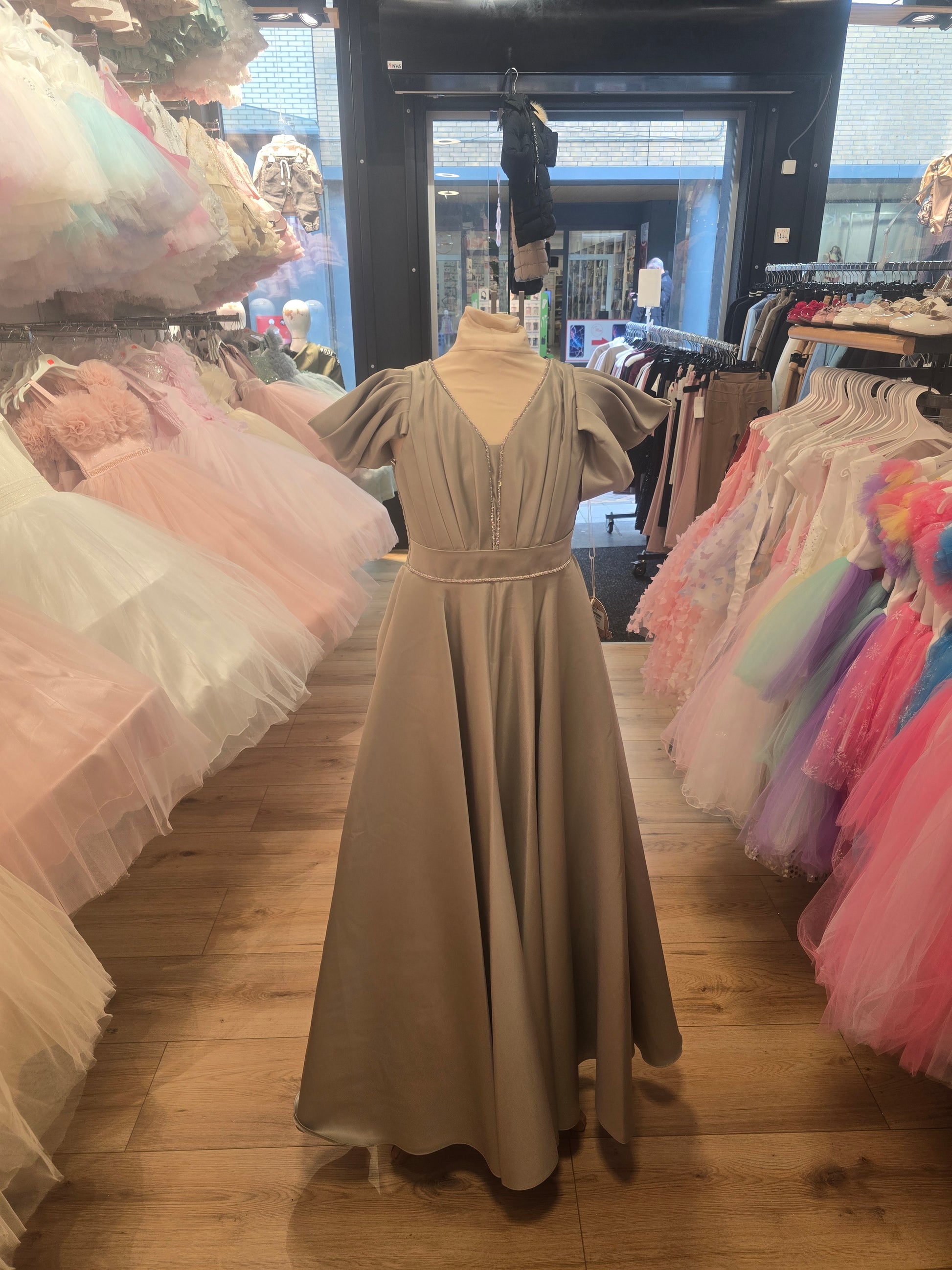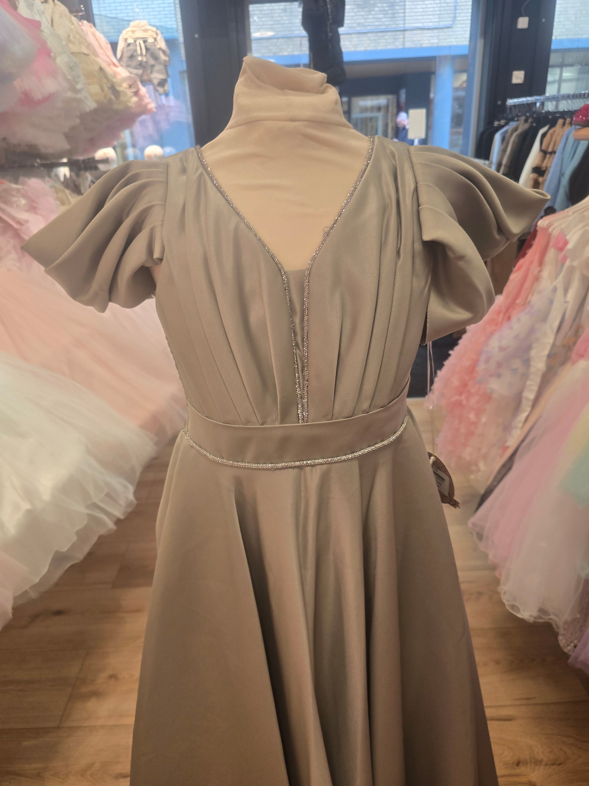 Een betoverende creatie in het groen die elegantie en jeugdigheid prachtig combineert. De jurk heeft een zachte, glanzende satijnlook, een stijlvolle vierkante halslijn en opvallende volantmouwen die zorgen voor een moderne en speelse uitstraling.